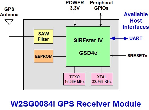 The W2SG0084i module is robust, reliable and compact GPS receiver module based on CSR's SiRF Star IV™ architecture, featuring excellent receiver performance. It provides easy, flexible and scalable way for system manufacturers to add GPS positioning, locationing and/or navigation capabilities to their products. This module includes integrated MAC, baseband, RF front-end, LNA, crystal, oscillator, SAW filter and EEPROM to store configuration and application data. It is fully optimized to yield excellent receive sensitivity performance through careful design. It supports UART host interface. It is certified for global markets and supports full operation in industrial operating temperature range.